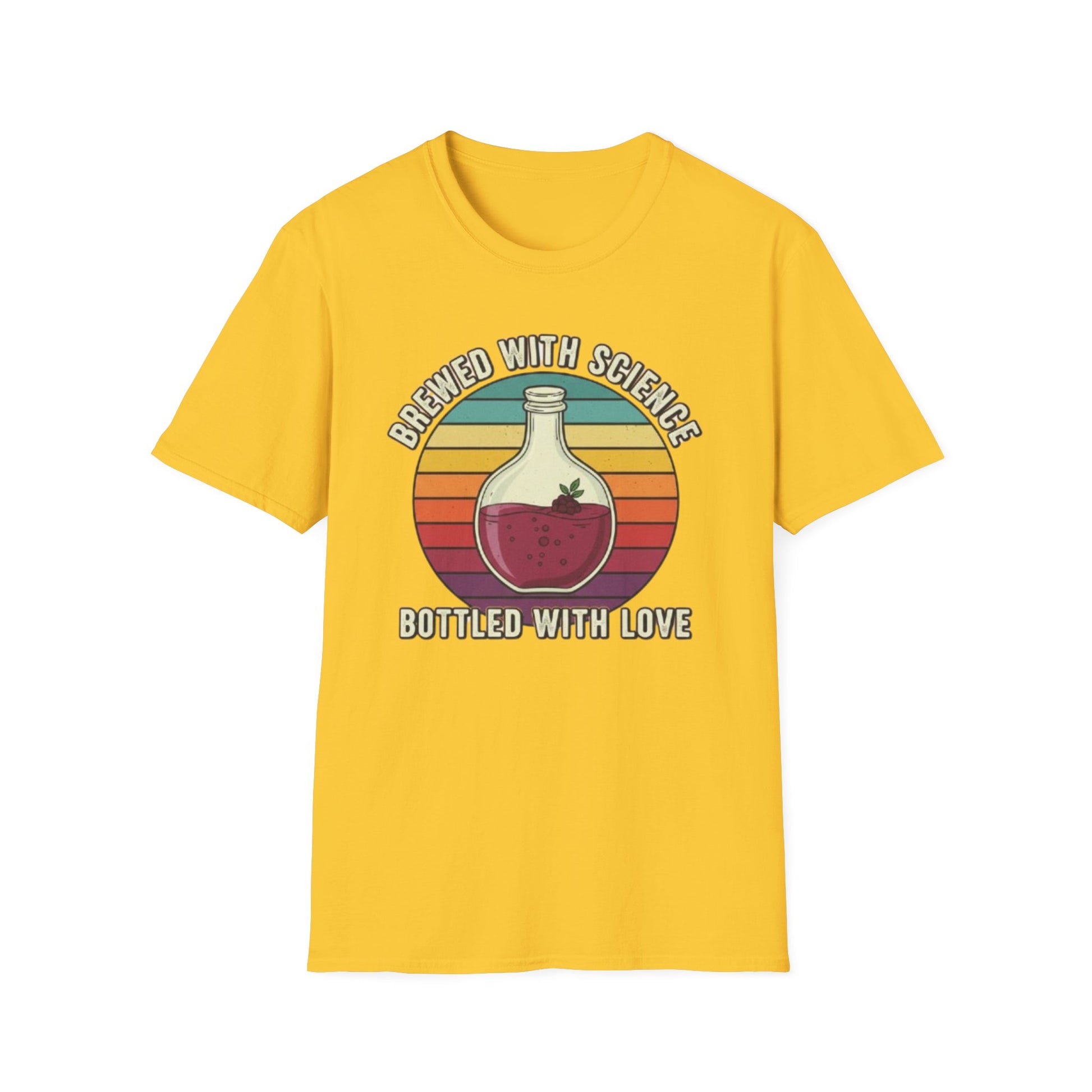 The official uniform of every homebrewer who treats their garage like CERN and their carboy like a newborn. This bold graphic tee proudly declares **“Brewed With Science – Bottled With Love”** over a vintage-style brewery lab design complete with beakers, hops, yeast, and bubbling fermenters – because real craft beer isn’t magic… it’s just really nerdy chemistry with better results.