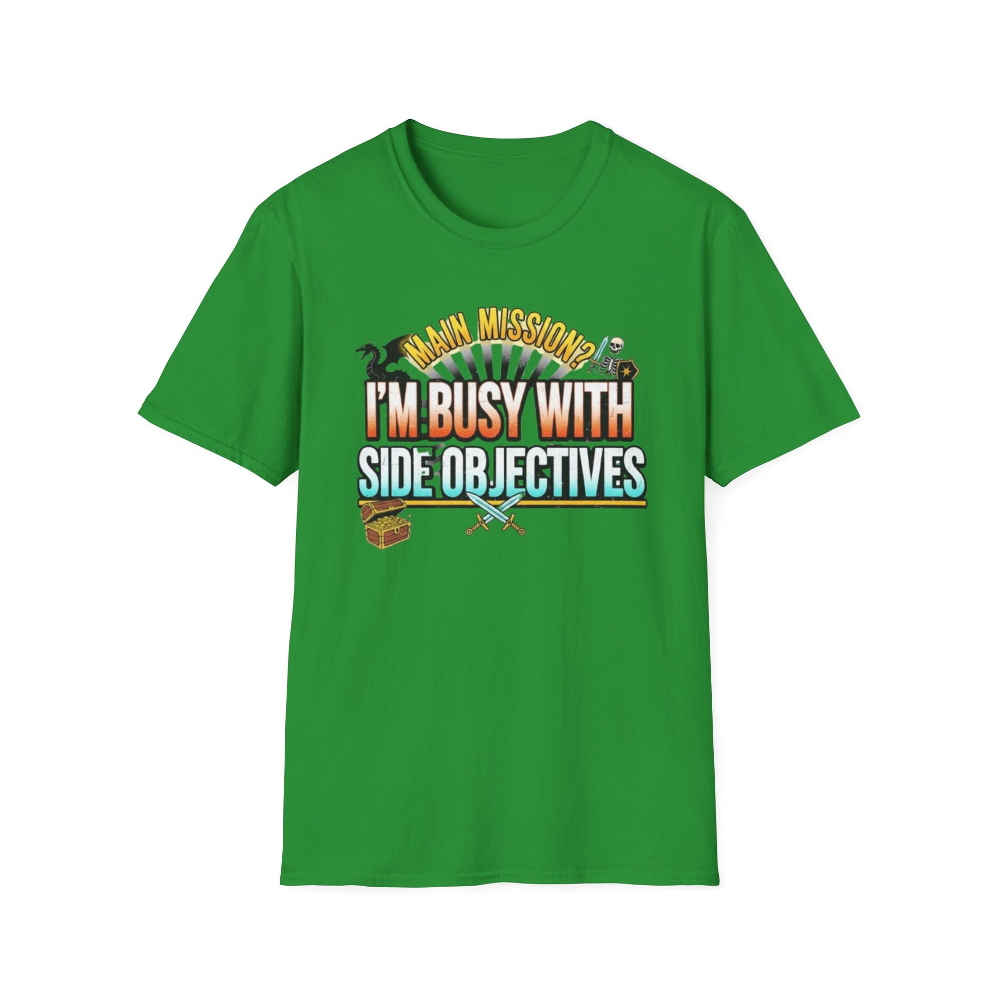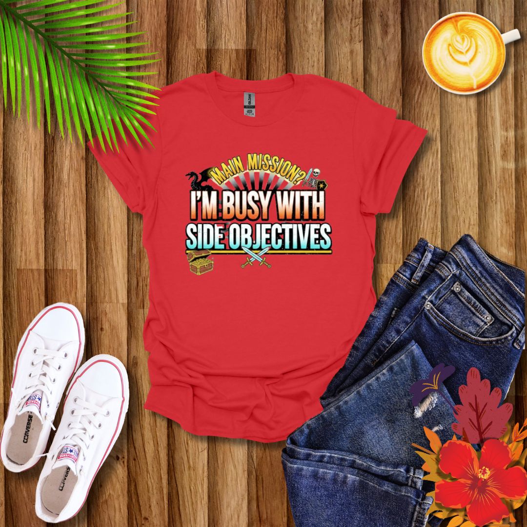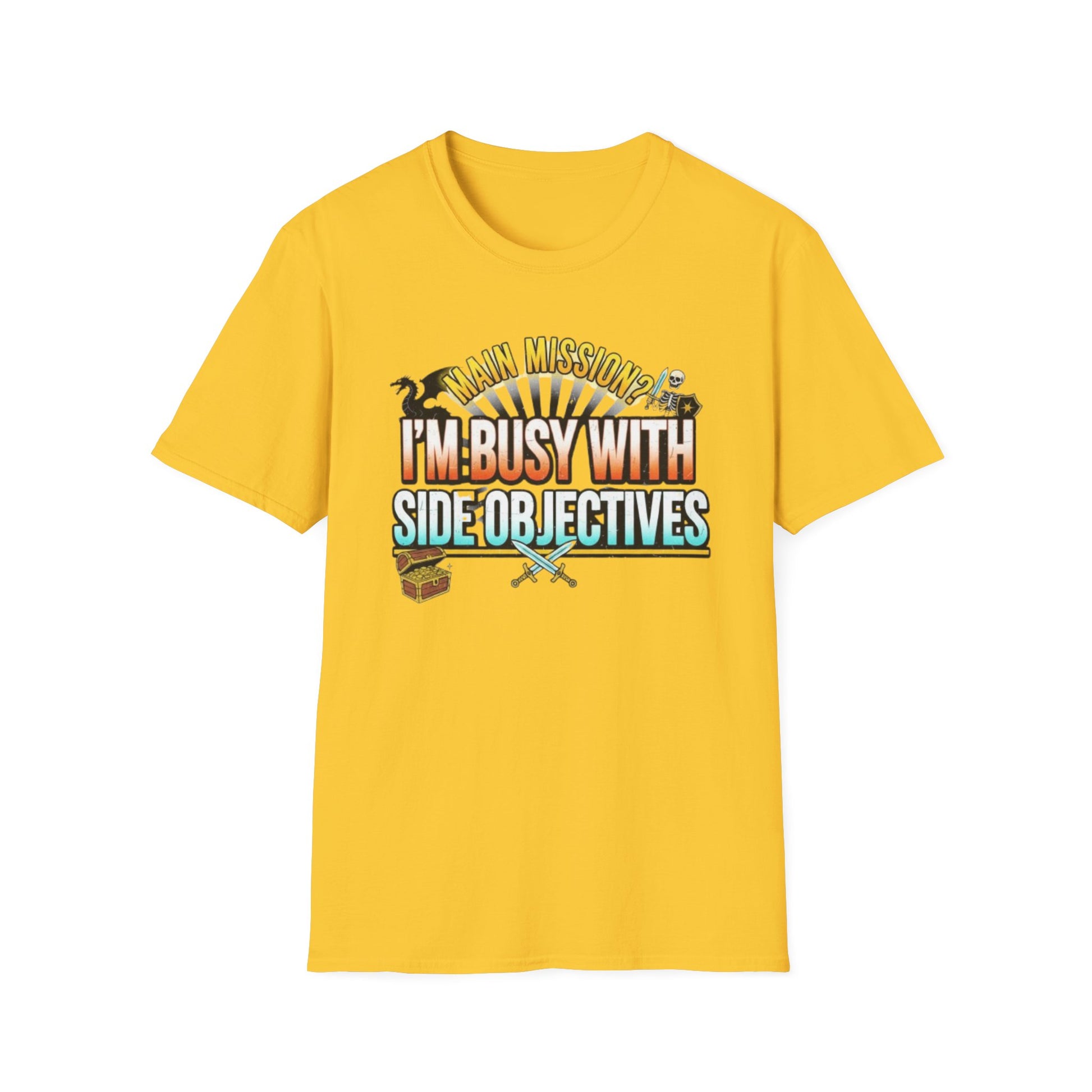 "Main Mission? I'm Too Busy With Side Objectives" Gaming T-Shirt – Ultimate Gamer Humor & Completionist Tee