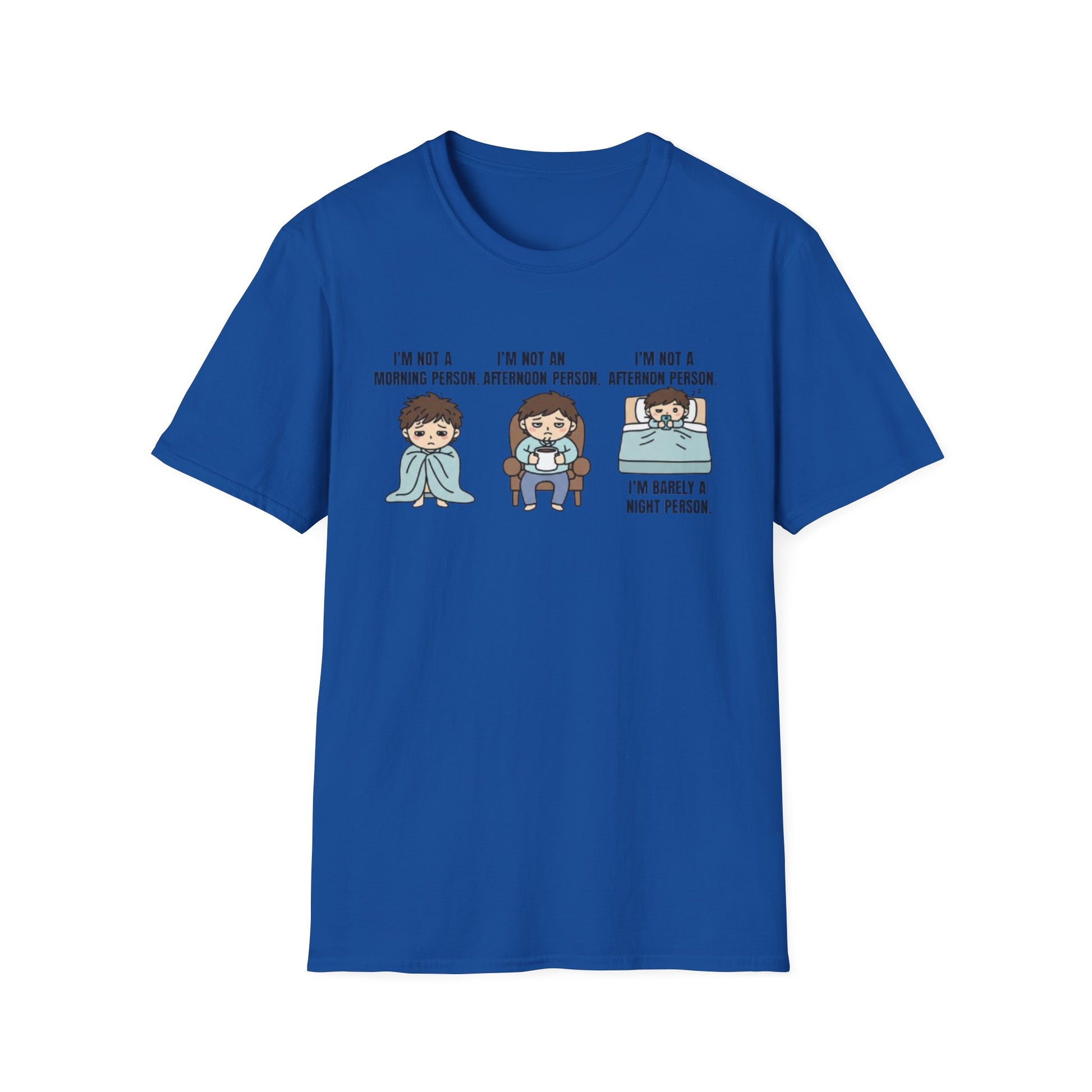 If you’ve ever found yourself struggling to function at any time of day, this "I’m Not a Morning Person. I’m Not an Afternoon Person. I’m Barely a Night Person." graphic tee is your new go-to. Whether you're hitting snooze one too many times, surviving the afternoon slump, or just barely making it to bedtime, this shirt humorously sums up the life of the chronically tired.